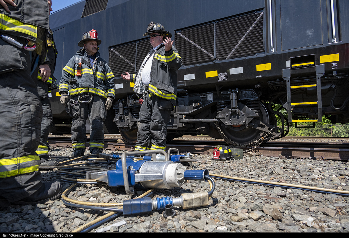 Chain the brakes! On the morning of July 22nd, 2023, CTrail (CTDOT) hosted a simulated grade crossing emergency response drill at Meriden Yard along the MRS (Hartford) Line in Meriden, Connecticut. The drill gave several local first responders the opportunity to practice and learn on live railroad equipment. In this photo, firefighters conduct a job briefing after securing the brake shoe against the wheel of CTrail Extra 6499's leader, rebuilt Connecticut Department of Transportation (CTDOT)/CTrail (CTDX) GE P40BH 6706. This method would be used in the event of a failure with the locomotive's parking brake.