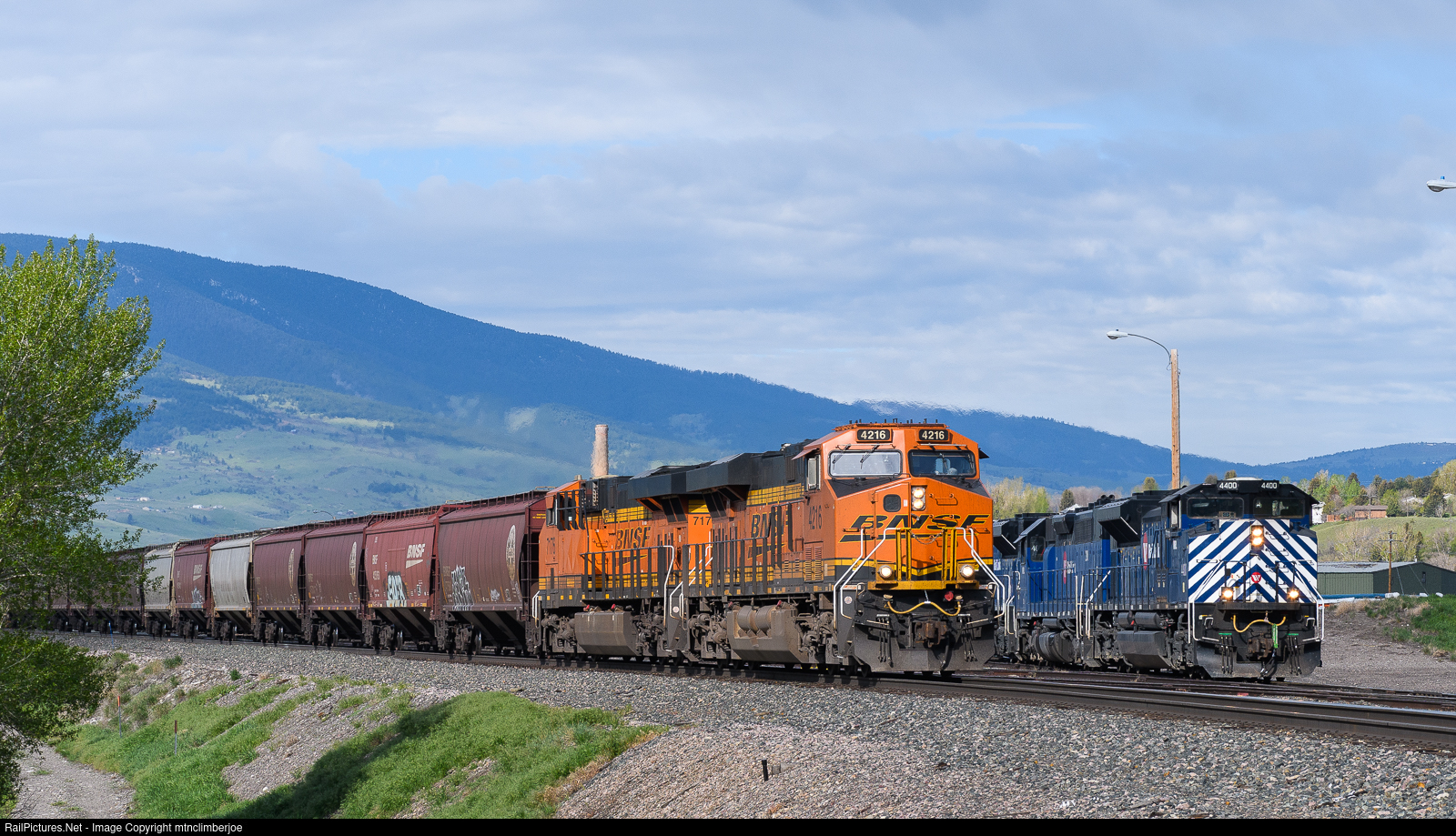 | A pair of BNSF ES44C4's lead an empty grain train as it hustles east through Livingston, Montana after descending from Bozeman Pass. Meanwhile, a Montana Rail Link helper set eases out of the yard to cut in to the middle of a westbound loaded coal train, which it will assist up and over the pass. |