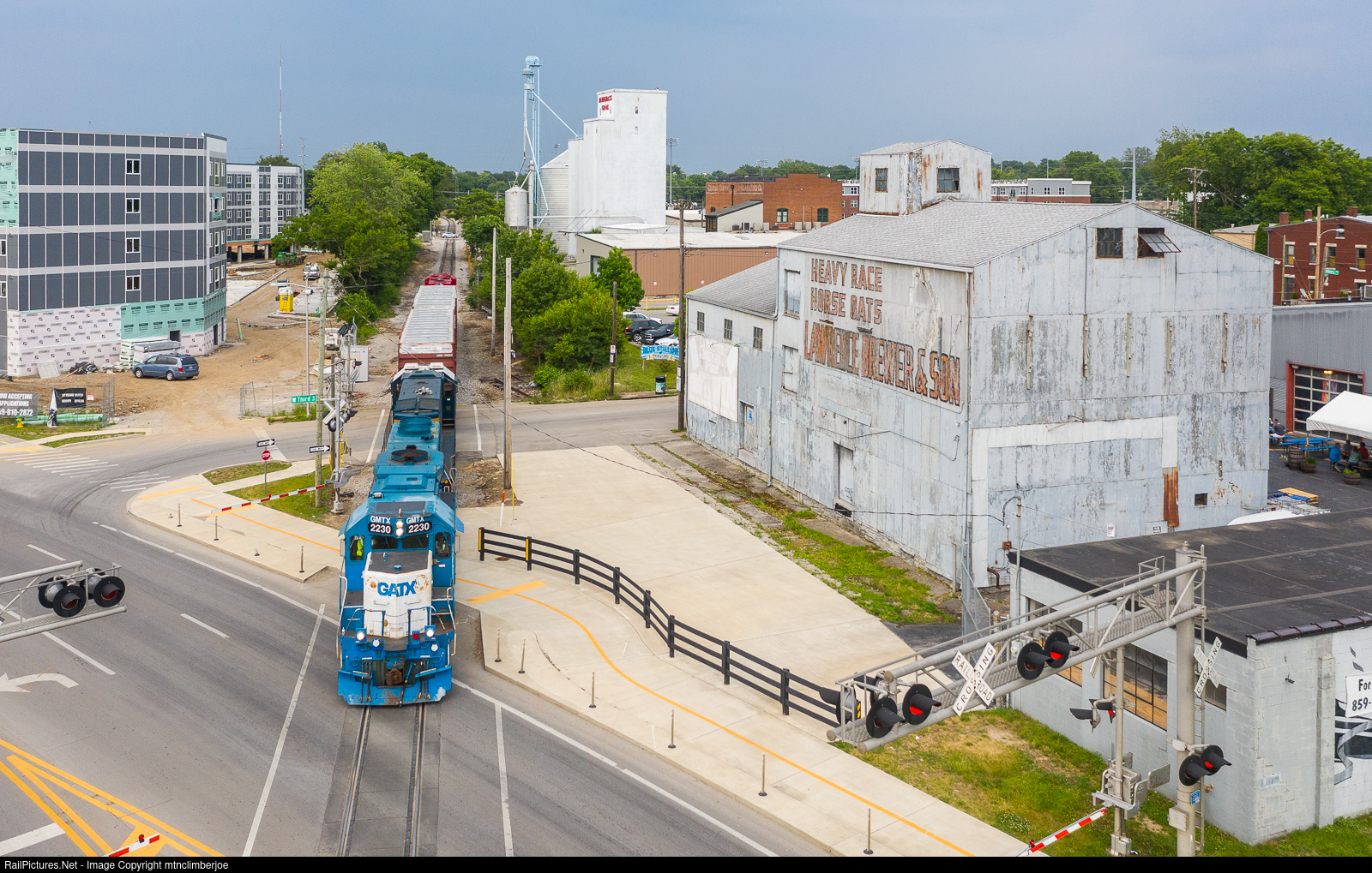| An RJ Corman local cuts between old and new buildings as it heads back towards the yard in Lexington, Kentucky after switching out the Standlee Hay Company. A GATC GP38-2 and an ex CSX GP15 lead the train, while an RJCC RS23BD brings up the rear. |