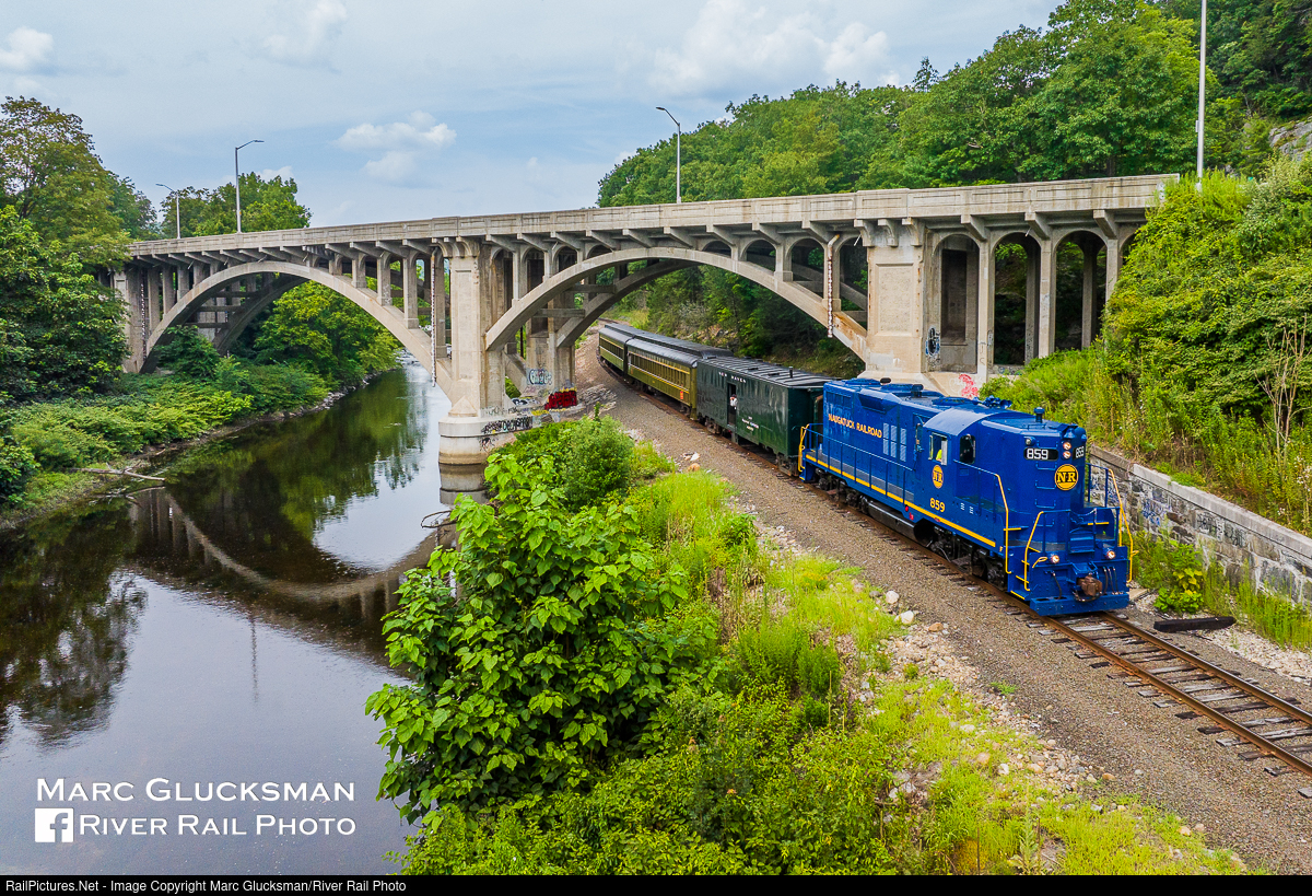 Scenery On The Scenic Train. On Saturday, August 5, 2023, NAUG 859 (née-NW 859, GP9, 6/1959) held down the assignment as the power for the day at the Railroad Museum of New England. The striking "Pevler Blue" color, named after President of the Norfolk And Western Railway Herman H. Pevler has quickly become a favorite on the Thomaston, Connecticut based railroad operation. Also recently painted, New Haven 3659 was built as a troop slpr in 1945 and was later converted a "bag-mail-express" car. The Naugatuck River Scenic Train was the last run of the day, departing from Thomaston at 2:30 PM for Waterbury, and offering passengers a stop over at a local business as the power ran around to the other end of the train before returning to the station. The train is seen on the curve along the Naugatuck River approaching Reynolds Bridge in Thomaston, Connecticut.