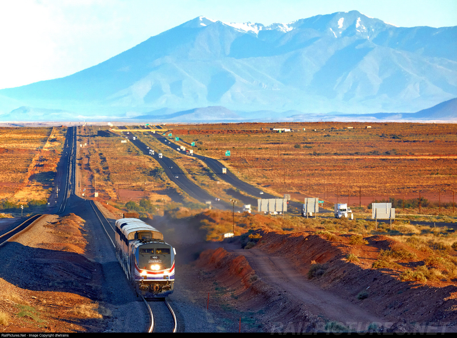 | Eastbound southwest chief #4 being led by Phase 3 Heritage Unit (Pepsi can) about to get to its next stop 'Winslow'. This spot is frequented by rail enthusiasts and provides a vantage point to photograph trains on the BNSF transcon between Belen and Flagstaff along with a ribbon straight I-40 running parallel to the railroad |