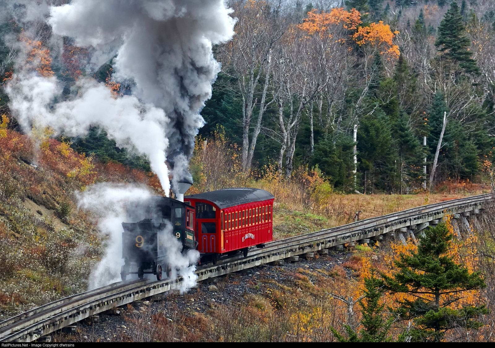 | MW9 (Waumbek), built in 1908, is a Steam 0-2-2-0 coal-fired steam locomotives manufactured in New Hampshire at the Manchester Locomotive Works continue to work the rails on Mount Washington is seen in the picture ferrying tourists up the hill to Mt Washington.