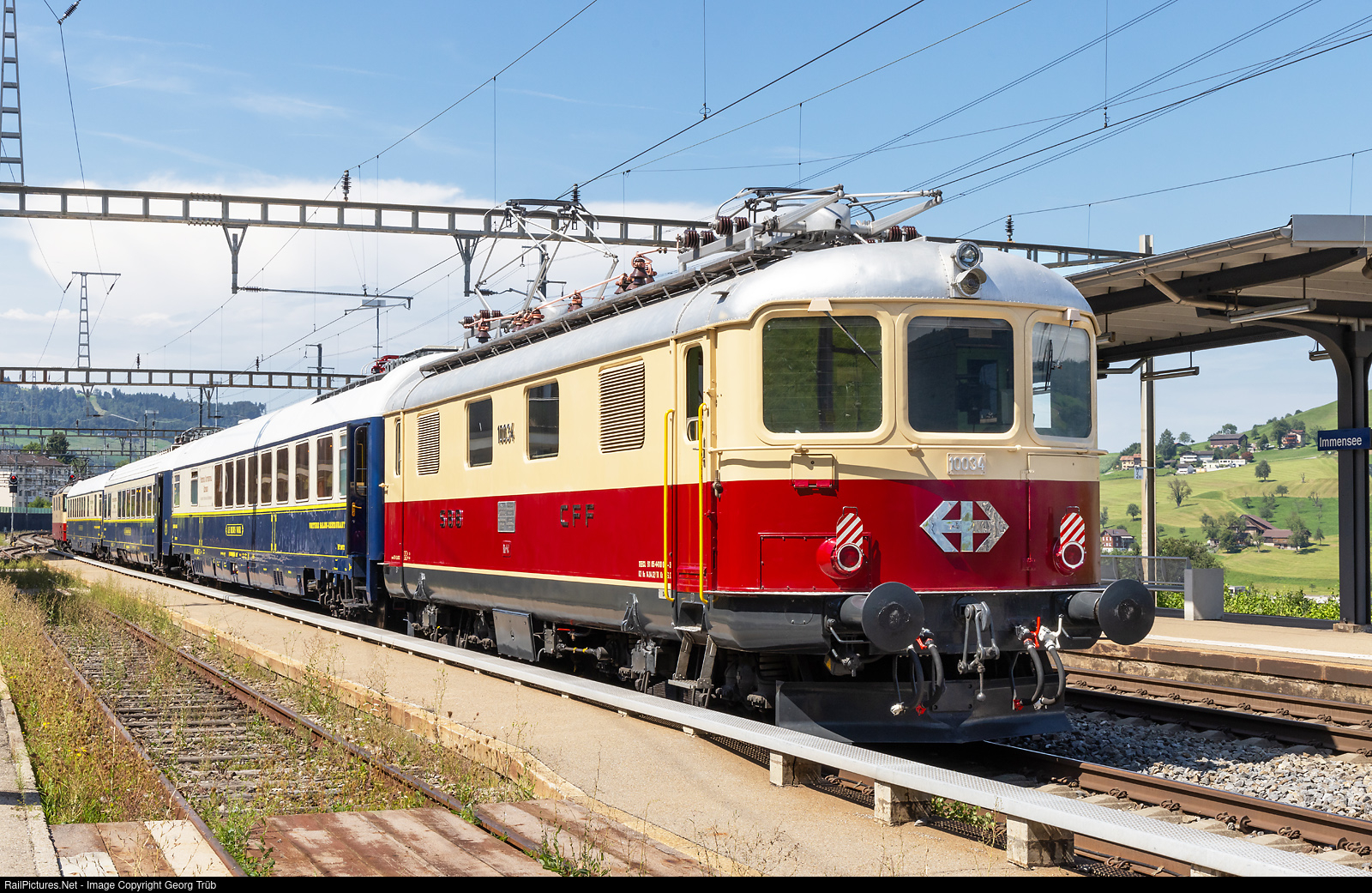 Former SBB Re 4/4 I # 10034, now privately owned and operated by association "TEE-Classics", is in the rear of the charter train "TEE Innerschweiz II", organised by TR TransRail in Immensee. The journey this day was from St.Gallen via Wattwil-Rapperswil-Arth Goldau-Lucerne-Zug-Sihlwald-Zürich Giesshübel-Zürich HB-Kloten-Winterthur back to St.Gallen. The cars were the 3 "Prestige Continental Express" (PCE) dining and bar cars of the IRSI. In the background the Re 421 # 393 (Re 4/4 II # 11393) of the IRSI, which pulled the train from Rothenturm til Lucerne.
