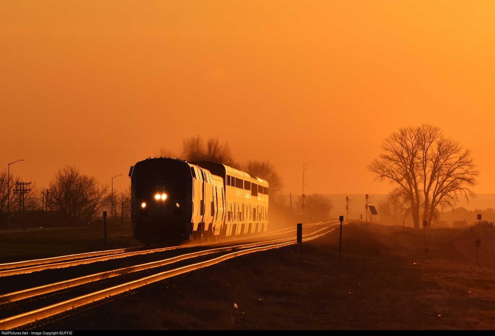 | Smoke from Canadian wildfires creates an orange glow at sunrise as the California Zephyr runs through Keenesburg, Colorado. |