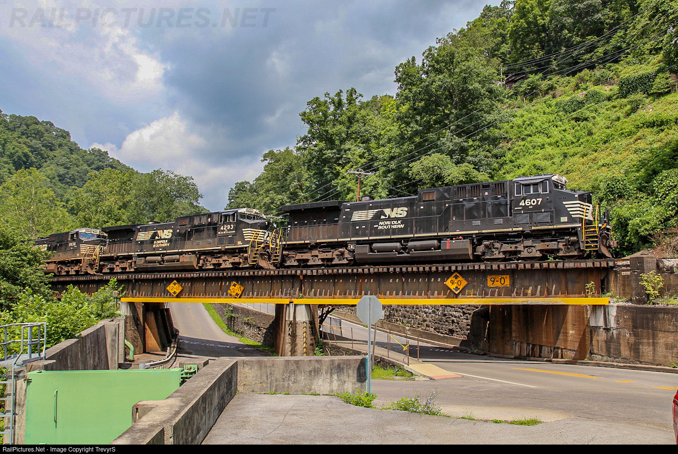 Strange Train: NS J46 rushes eastbound over the Welch trestle as it heads towards Bluefield. Normally, the J symboled trains consist of two to three unit helper sets that shove heavy trains east to Bluefield then return light power west to Farm. However, not only was this train powered by four locomotives and wasn’t pushing an eastbound train towards Bluefield, it had about 60 empty coal cars in tow. Usually, empty coal cars travel west to get loaded, and return east loaded. These factors made it a very strange train!
