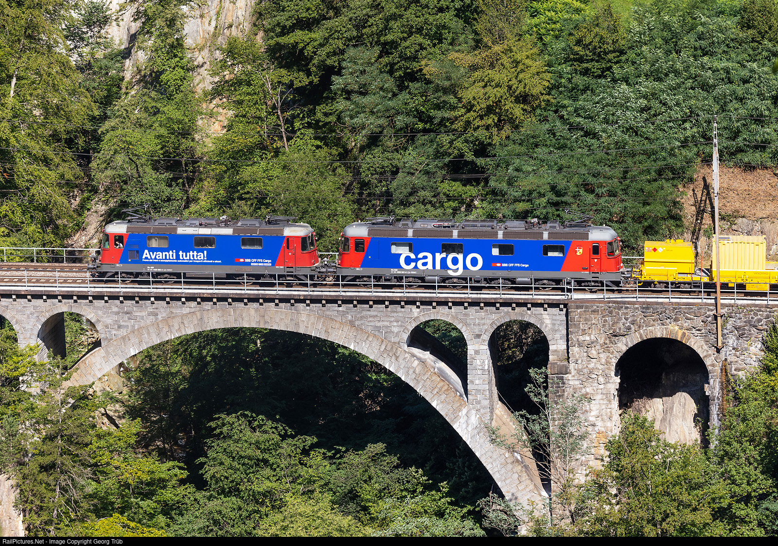 On August 10, a northbound freight train derailed in the 57-kilometer-long Gotthard Base Tunnel, and since then both tubes have been closed. All passenger traffic, as well as freight traffic that can pass through the smaller profile, travels via the Gotthard mountain route, today also called the panorama route. Re 420 # 288 and Re 620 # 067 "Bodio" of the SBB in multiple control pull the train 60501 from Basel freight yard to Biasca over the 42 meter long Intschialpbach bridge between Amsteg-Silenen and Gurtnellen. The load was the "VANOLI" railway crane XII "KRC1100" with material cars for work in the Base Tunnel (bring out about 20 derailed cars).