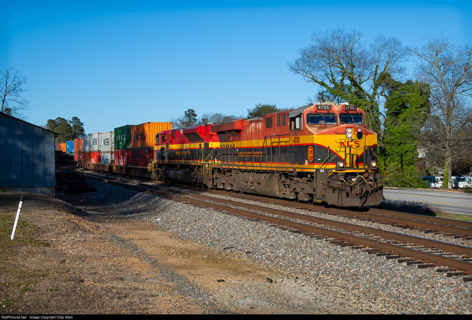 | On the final day of Kansas City Southern's independence from Canadian Pacific, a pair of belle-painted KCS motors lead NS train 243 from Charleston through Flowery Branch, GA on a beautiful early spring evening. |