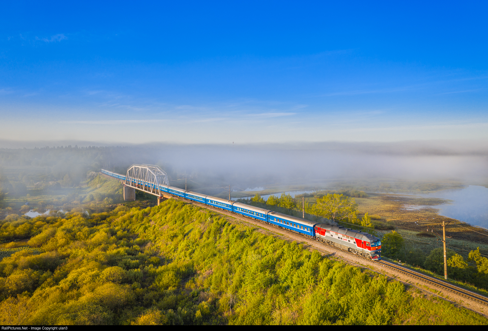 The diesel locomotive TEP70-0362 is leading a passenger train from Brest to S-Petersburg.