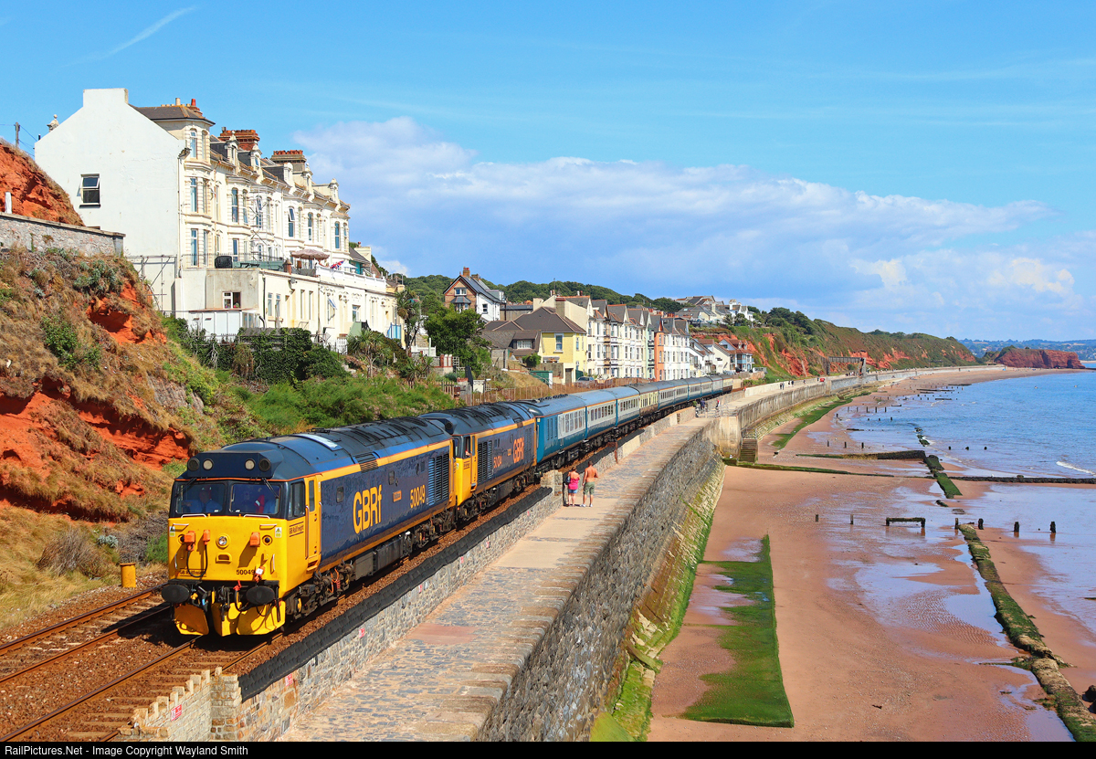 50049 & 50007 the latter masquerading at 50034 approaching Dawlish with an excursion.
