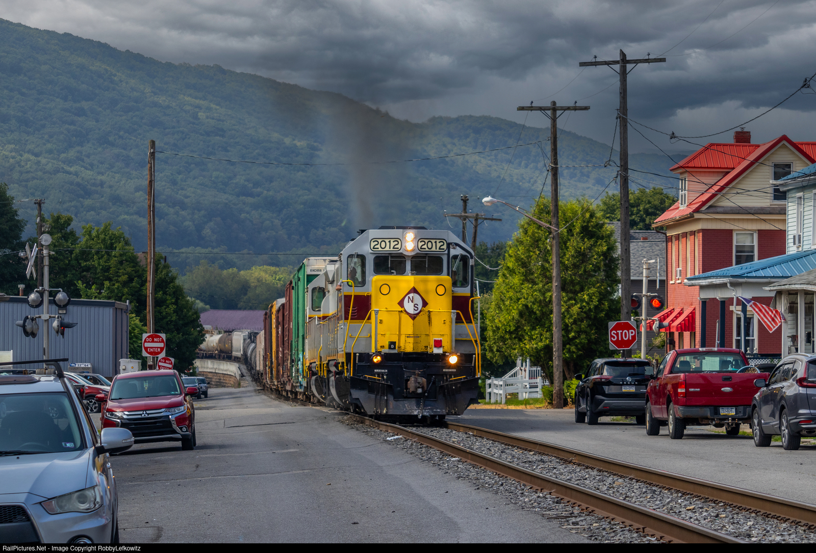 North Shore 2012 brings the Nittany & Bald Eagle local out of the interchange yard with NS in Tyrone, PA as it runs the streets in downtown Tyrone, as it tries to outpace the blooming thunderstorms that are forming over the mountains. |