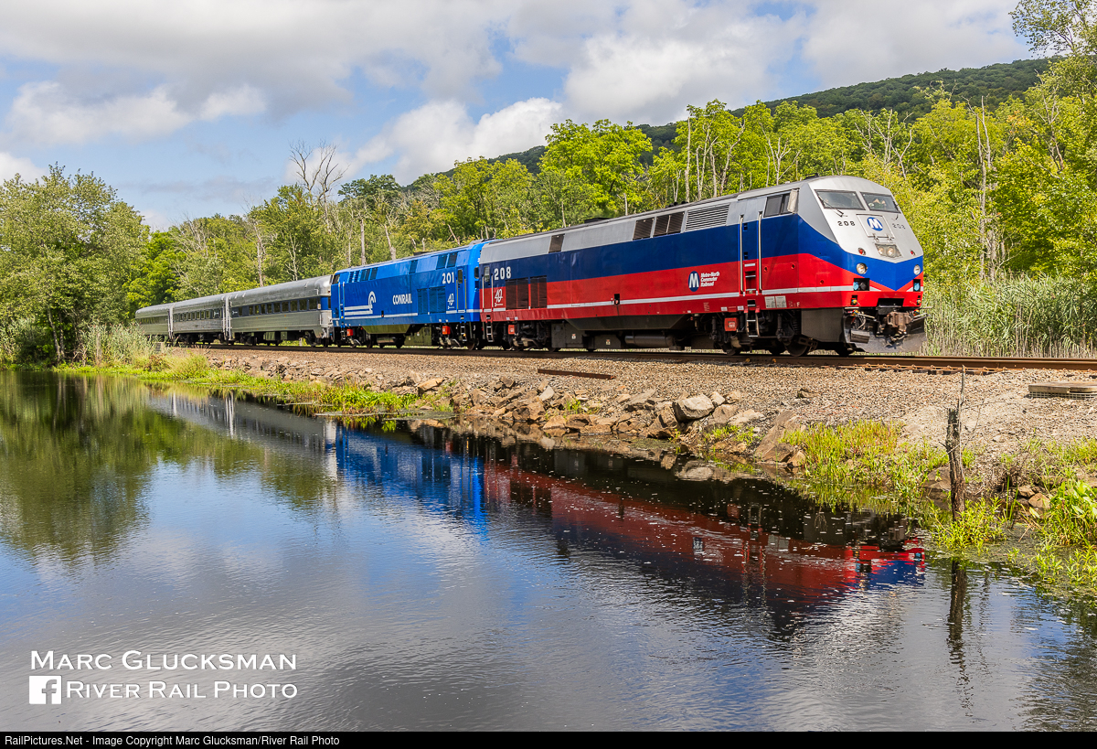 Heritage Reflection. On Wednesday, August 16, 2023, MTA Metro-North Railroad operated an Inspection Train with recently wrapped heritage units MNCW 201 (Conrail/MTA) and 208 ("Beachball") and its 3 office cars. The cars are in fact old, one former New York Central and the other two former Lackawanna Railroad. The locomotives are contemporary models, but "wrapped" in the paint scheme of predecessor railroads. The train headed up the Harlem Line to Wassaic, where the locomotives ran around the cars for the return trip to Grand Central Terminal, giving railroad executives and management the opportunity to inspect many ongoing, completed, and needed improvements on the line. The train's reflection in the Swamp River near Pawling, New York was a perfect fit for the space available before the crossing at Old Pawling Road.