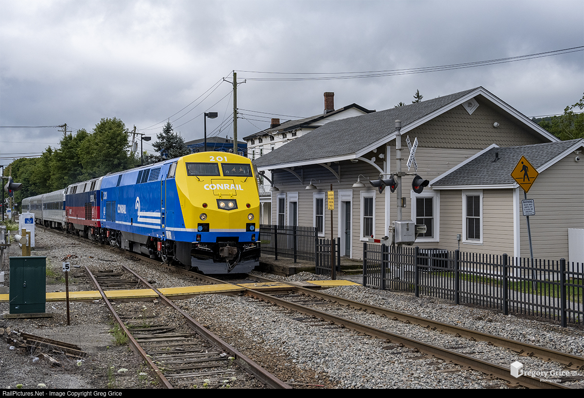 On August 16th, 2023, Metro-North ran an Inspection Train from Grand Central Terminal to Wassaic, New York to give members of management the opportunity to view several ongoing and completed projects along the Harlem Line. The train consisted of 3 inspection/OCS cars led by two of the railroad's 40th Anniversary heritage-wrapped P32AC-DM's, MNCW 201 ("Conrail") and MNCW 208 ("Beach Ball"). In this image, the train is passes the former stationhouse in the hamlet of Dover Plains, New York while darting north up the Harlem Line towards Wassaic.