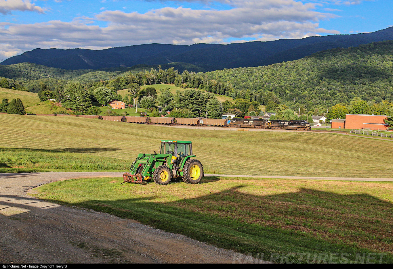 A westbound hopper rolls past a John Deere tractor in Shawsville, VA after a day of cutting hay. The clouds were scattered to broken which gave the mountains a surreal blue look to them while the train was in a nice pocket of golden sunshine.