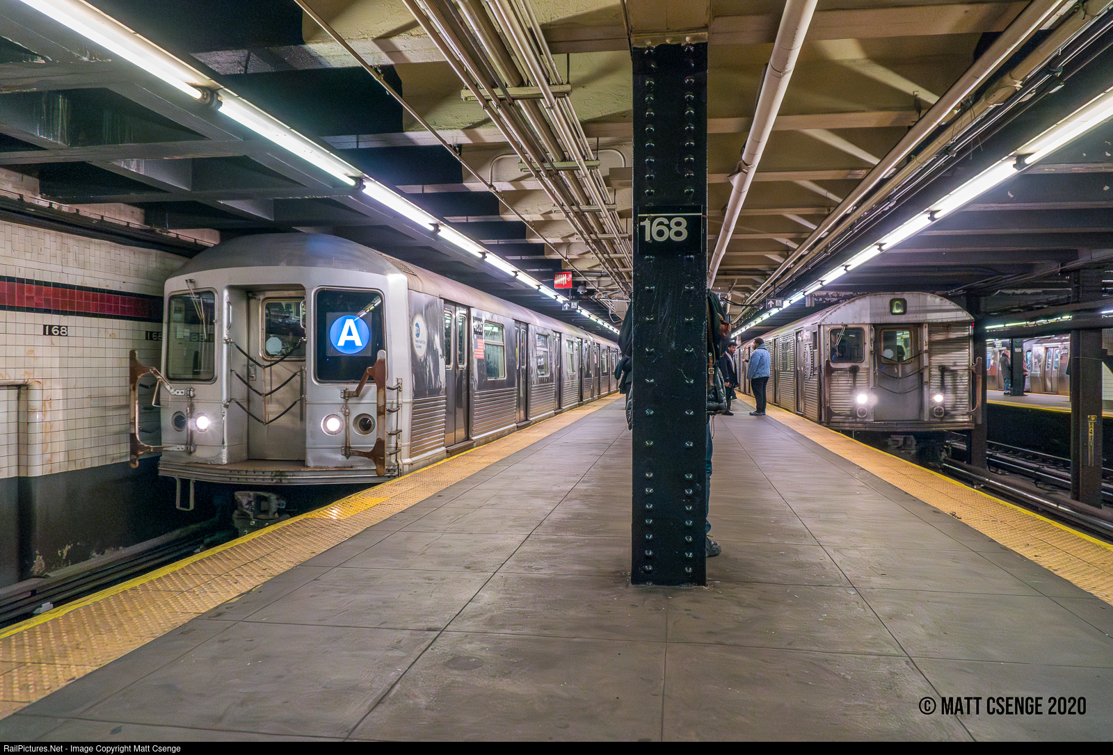 New York City Transit Authority (NYCTA) R32 (Budd, 1964-1965) and R42 trains (St. Louis Car Co., 1969-1970) are seen at 168th St Station on the IND 8th Avenue Line. The R32 at right is a C service waiting to enter service, and the R42 at left is a special A service making the final revenue service run for the car class, the last few of which had been living out their final year or so running the five daily morning and afternoon peak-hour Z trains.