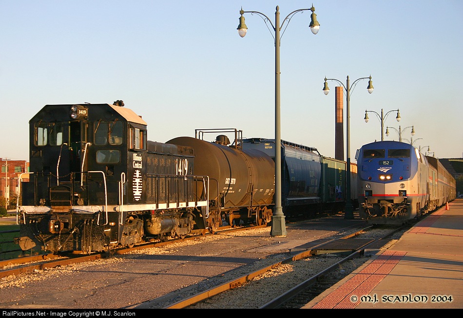 As the sun rises in Memphis IC 1419 is in Central Station as "The City of New Orleans" pulls in with engine 152 on the point.