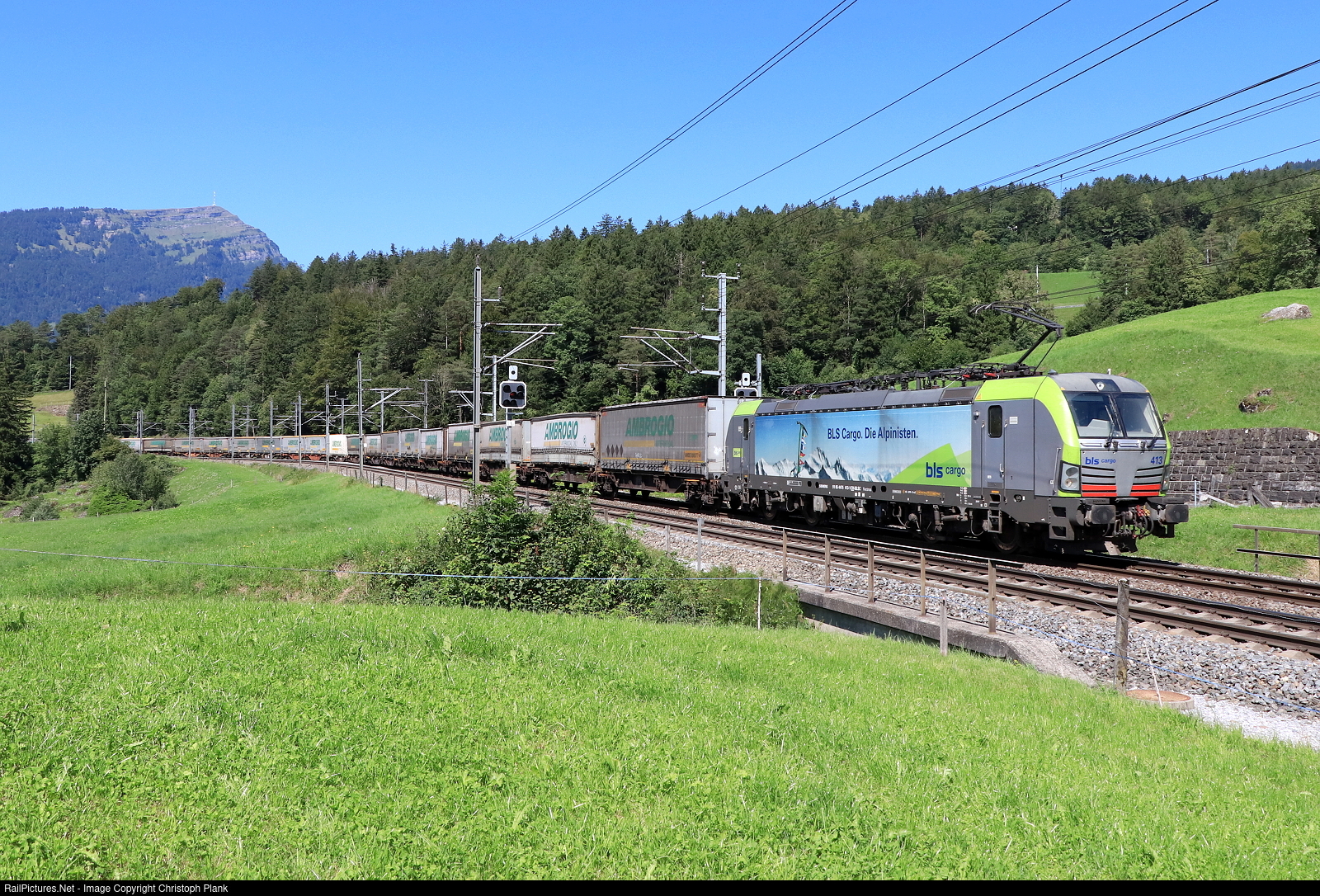 | BLS Cargo 193 413 with an Ambrogio intermodal train heading south in direction Italy and to the Gotthard Base Tunnel (worlds longest rail tunnel). In the background you can see mount Rigi |
