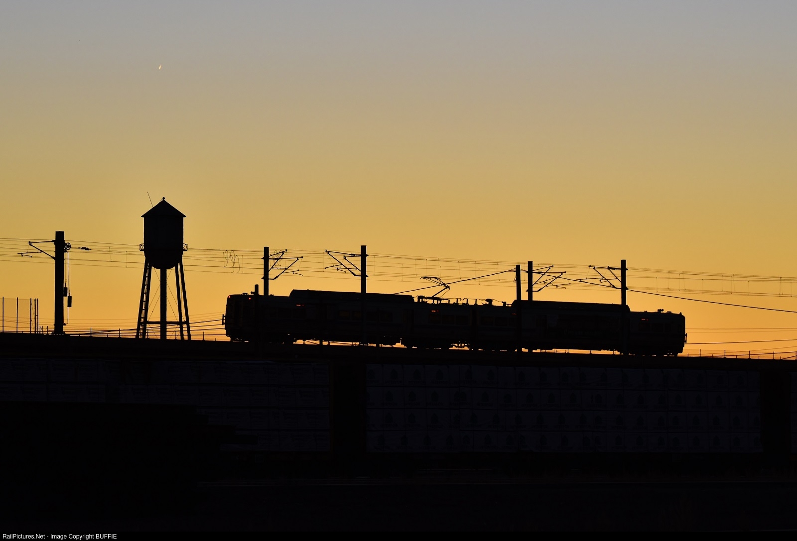 | RTD Light Rail Train #4032 (Hyundai P3 Eagle) runs on the elevated section next to the UP's North Yard in Denver, Colorado at dawn.