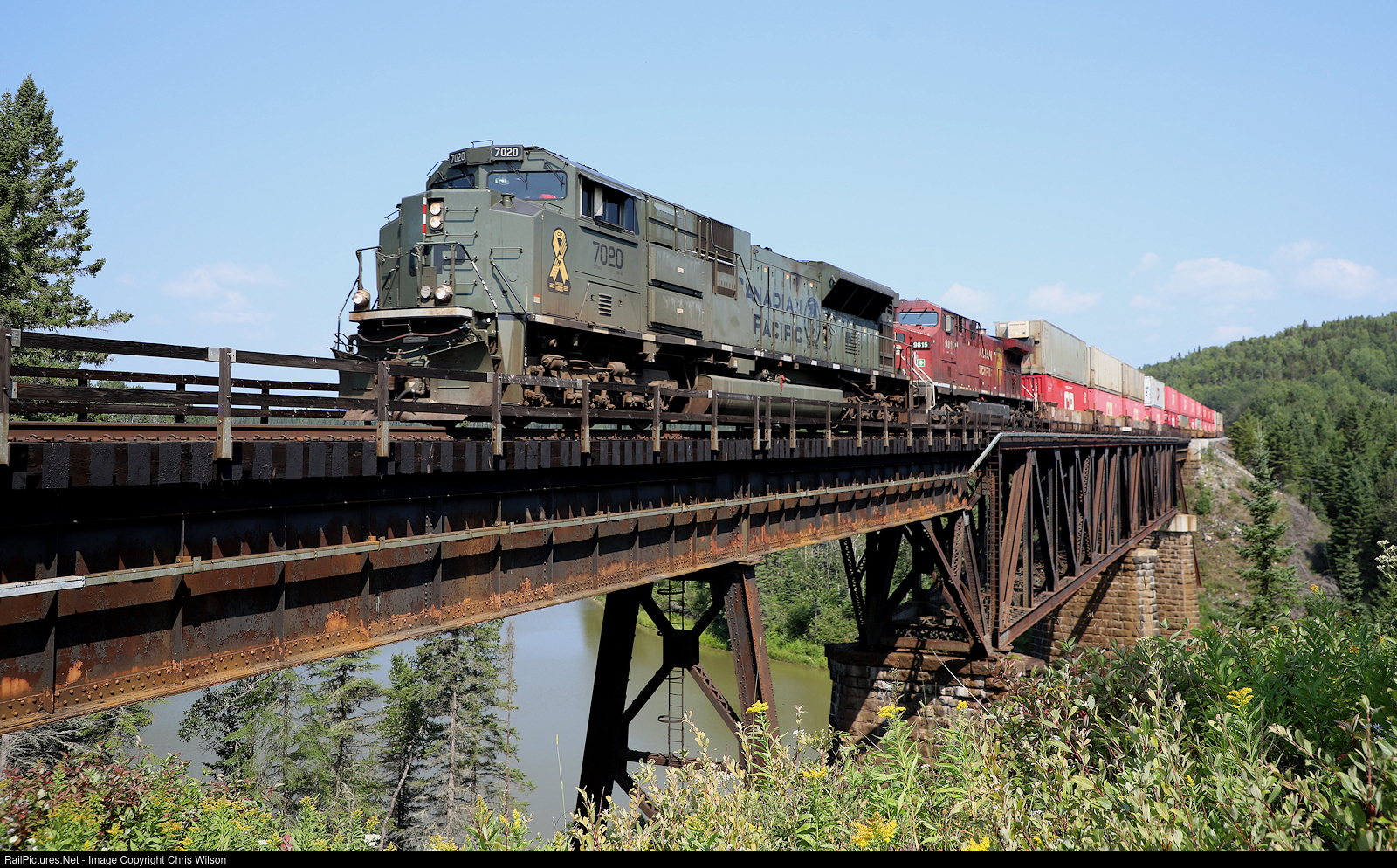 CP 7020 pulls 101's train across the Pic River approaching Heron Bay