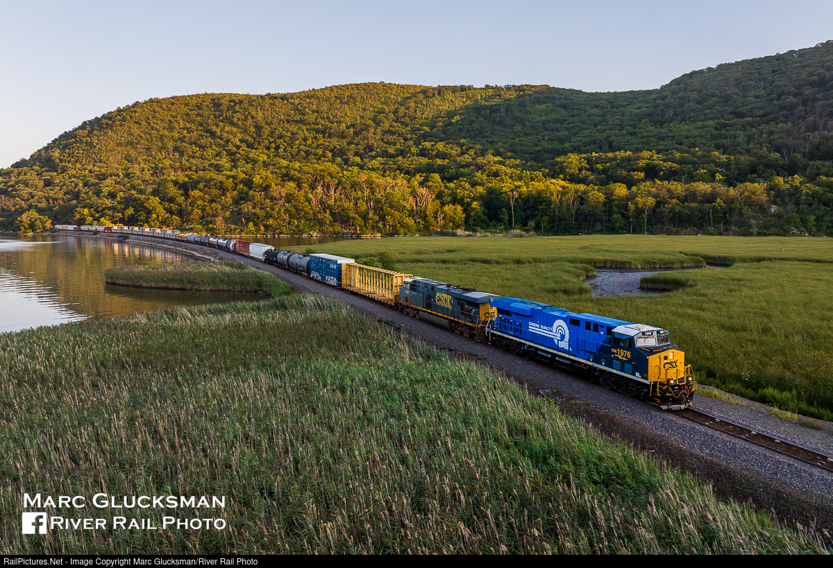 Conrail In The Beautiful Hudson Valley. CSXT 1976 (Conrail Heritage, ES44AC, GE) was leading CSX Train M434-19, seen crossing Snake Hole Creek near Tomkins Cove, New York on the evening of Saturday, August 19, 2023 with the hills of Roa Hook in the background across the Hudson River. This unit is one of a series that CSX has started to release with a modern CSX painted cab and a "heritage" body, with the scheme of a predecessor railroad and numbered for the year that company began operating. The sun was dipping below the mountains at about 40 minutes before sunset creating this view.