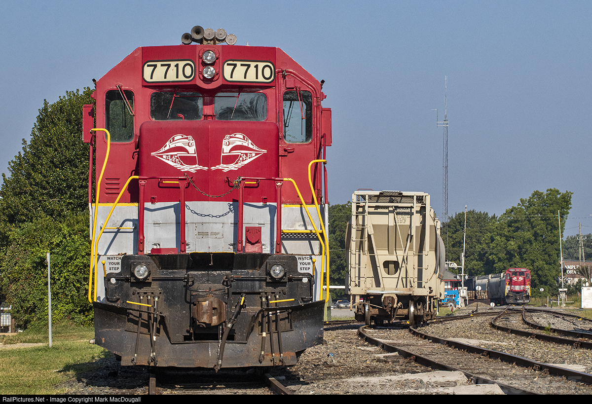 RJ Corman GP38 7710 rests in the Raleigh & Fayetteville yard while power for train RF01 to Raleigh sits in the background.