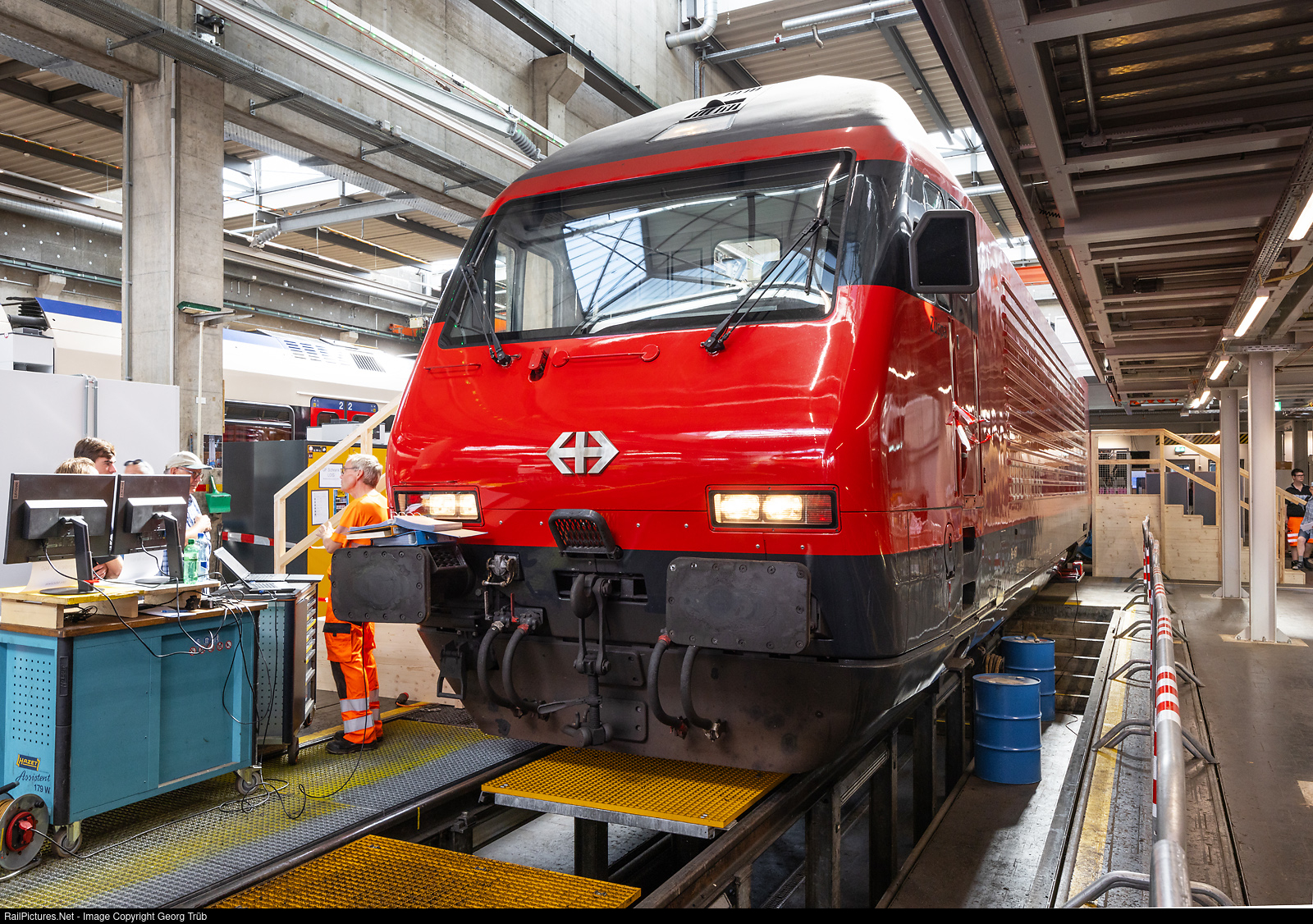 n the last years the service plant of the SBB in Basel was modernized and expanded. Here, about 150 people perform maintenance on the Astoro, Giruno, Flirt and Domino trains as well as on the locomotives of the Re 460 series, and also on the cars of the IC2000, EW IV and Eurocity types. On August 19, the modernized layout was shown to the public on an open day. Here you can see the freshly cleaned Re 460 # 050 with the roof lifted off and people could walk through the locomotive through the center aisle.