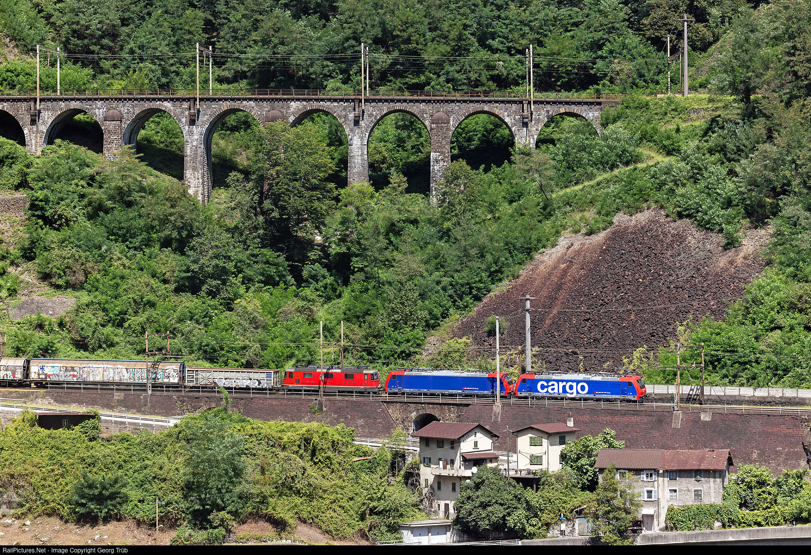 On ausgust 10, a northbound freight train derailed in the Gotthard Base Tunnel (GBT) and since then, both bores are closed. All passenger trains and some freights, which are able to go through the lower claerance, are rerouted over the "old" mountain line, now called panorama line. Freight train 60219 from the Limmattal shunting yard (RBL) to Bellinzona and Chiasso shunting yard, can be seen on the middle of three levels in the "staircase" of the Biaschina, between Lavorgo and Giornico. From the uppermost to the middle level, the train needed exactly 2 minutes. Pulling are Bombardier TRAXX F140 MS Re 484 # 001 and # 013 of the SBB in multiple control, towing the Re 420 # 332 (Re 4/4 II # 11332) with probably destination industrial works Bellinzona for repair or revision.