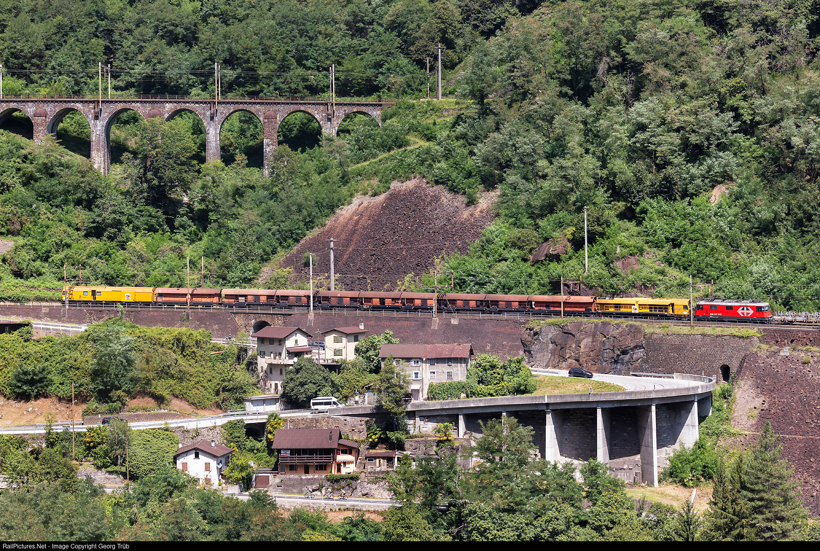 On ausgust 10, a northbound freight train derailed in the Gotthard Base Tunnel (GBT) and since then, both bores are closed. All passenger trains and some freights, which are able to go through the lower claerance, are rerouted over the "old" mountain line, now called panorama line. At first glance, it looks as if SBB's locomotive Re 420 # 213 LION is pulling Scheuchzer's "Grizzly 102" rail grinding train over the middle step of the spiral staircase in the Biaschina. In reality, this is the tail end of the rather long freight train 60219 from RBL to Chiasso, which can be seen by the fact that a flat car is still visible in front of the locomotive. The towed locomotive, probably on its way for maintenance at the SBB industrial plant Bellinzona, was lined up in the middle of the train.