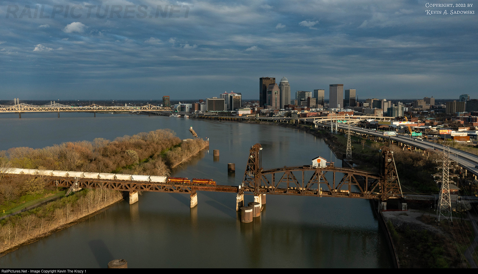 LIRC train JXT with the 2007 & 2302 cross the Louisville & Portland Canal section of the Ohio River as the train enters Louisville, KY with interchange traffic for the NS.