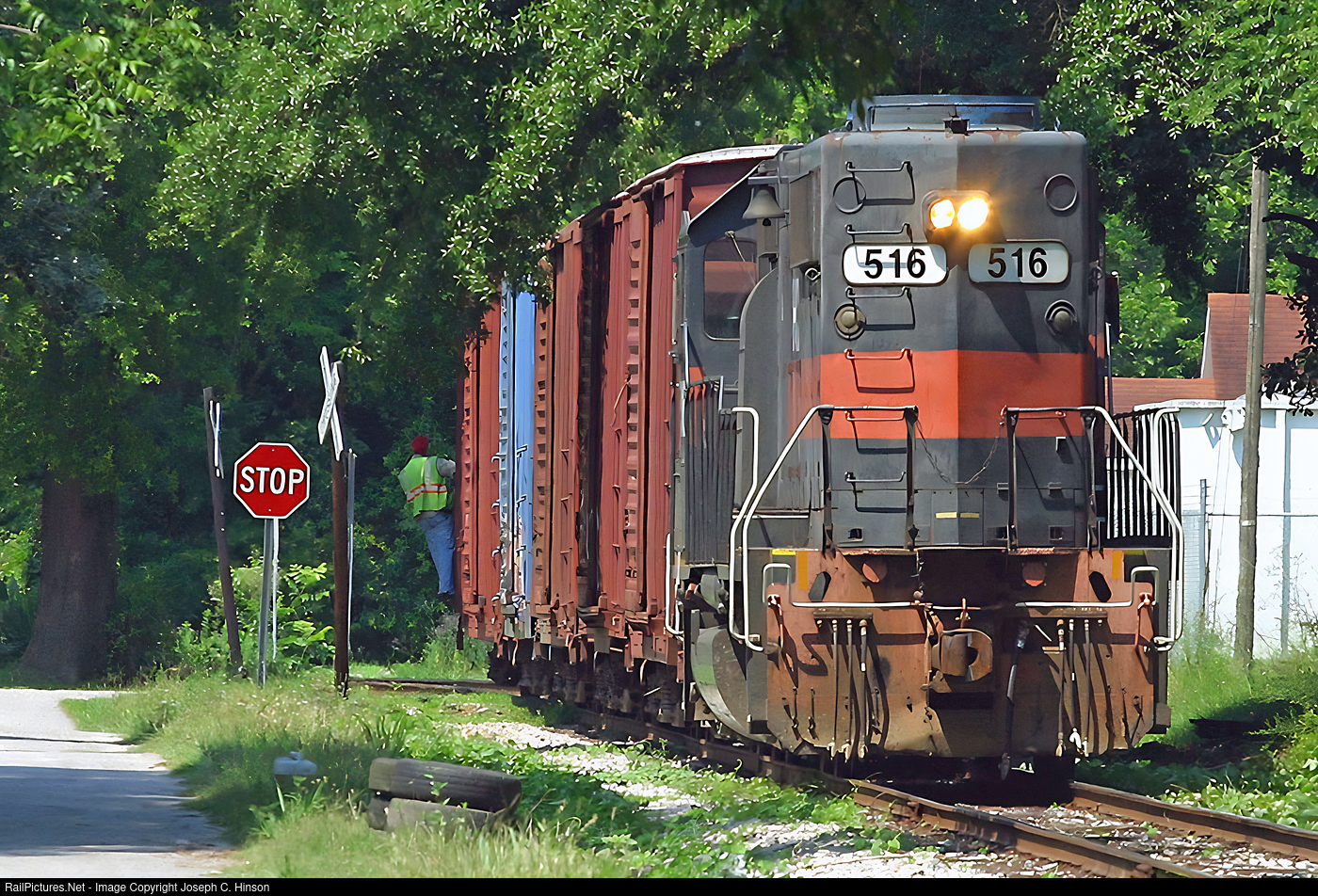 A South Carolina Central crew is shoving through a neighborhood in Hartsville, South Carolina in June 2006. The railroad was still owned by RailAmerica at the time and it survived for years without any RA-painted locomotives plying the rails.