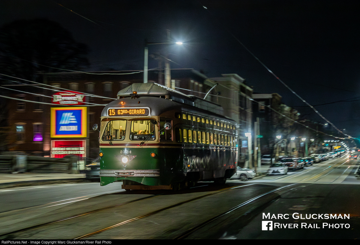 Speeding To The Finish. In 2020, I wrote: While PCC-II 2324 was going at a good clip when it crossed 31 Street on Girard Avenue while operating on the Route 15 on the evening of Friday, January 24, 2020, it wasn't going quite that fast. A "tilt-pan" blurs the background while keeping the subject in focus. SEPTA has announced that this is the last day for trolleys and it will operate buses on the Route 15 until further notice. Revisiting this pic in 2023, perhaps it should be re-titled "Speeding To The Start" as SEPTA has announced the restart of trolley car service on the Route 15 line will commence on Sunday, September 10, 2023.