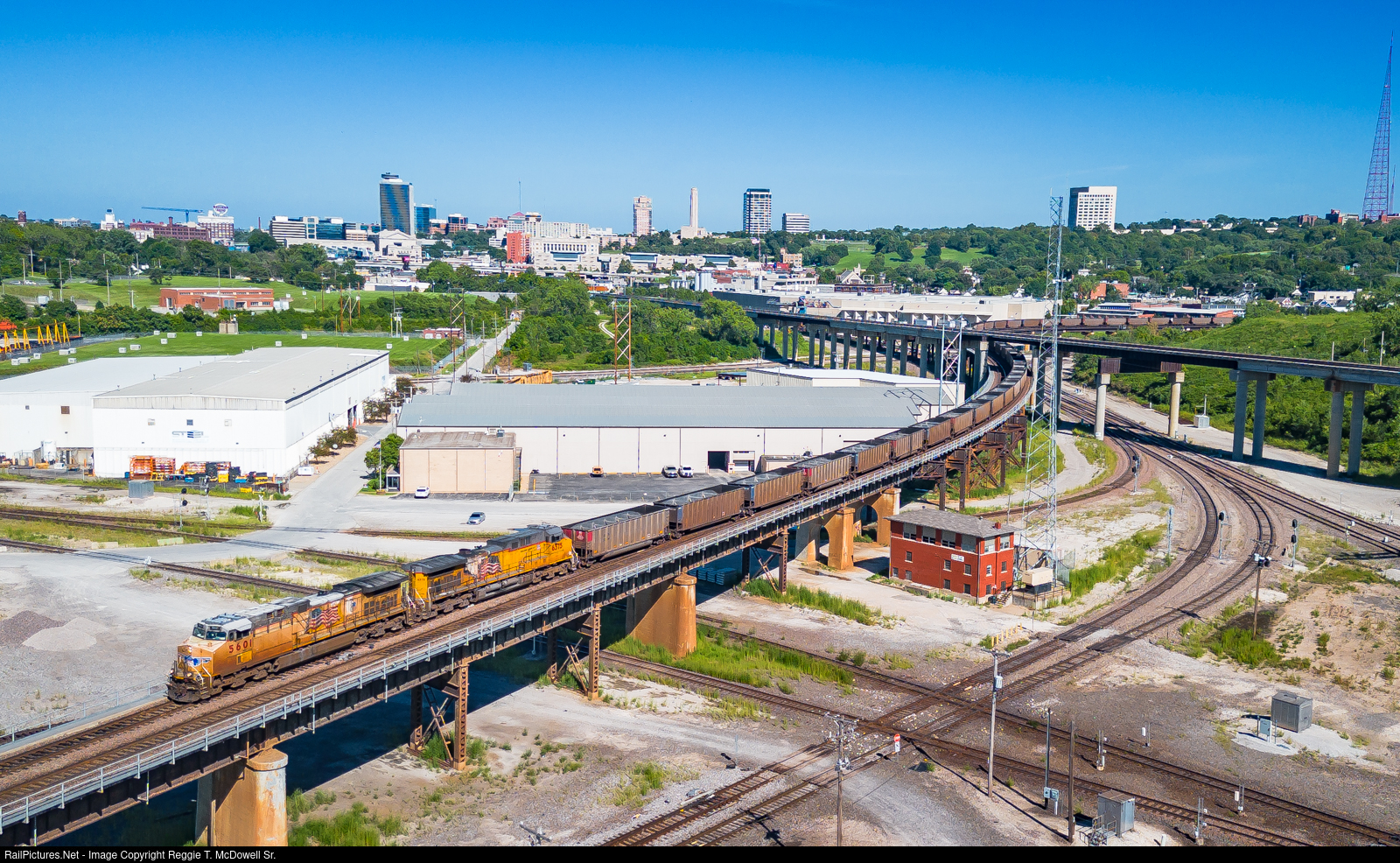 | A UP empty coal train is coming off of the BNSF Fort Scott Sub and on to the KCT High Line where they will head over to Fairfax on the other side of the Kansas River for a crew change and the westbound trip on the UP Falls City Sub. |