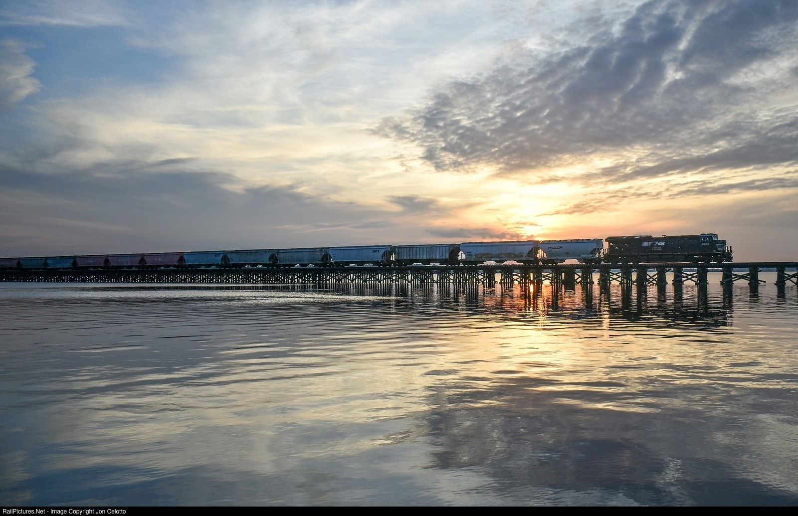 A really nice sunset provides a backdrop for NS P97 as they leave New Bern for Chocowinity, crossing over the Neuse.