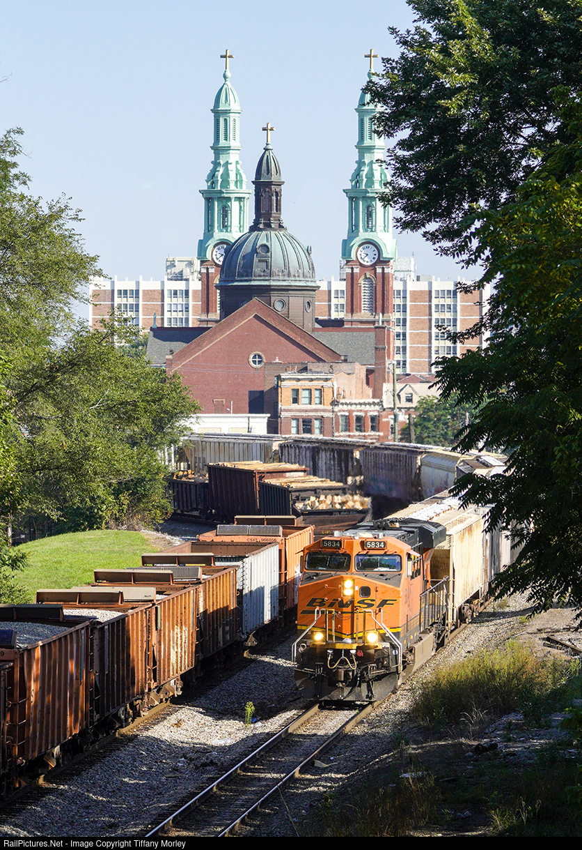 | A morning Southbound empty phosphate train (Cicero, IL (BNSF) to Mulberry, FL) passes a Northbound manifest under the Mother of God Catholic Church steeples and spires. |