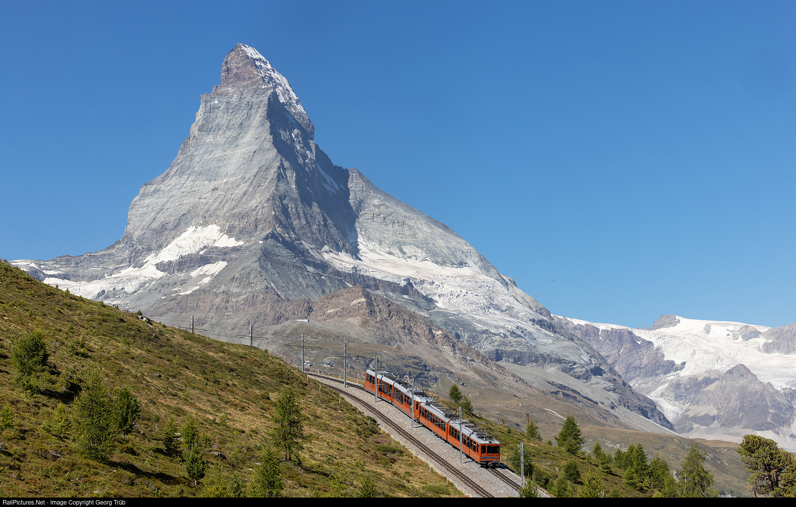 | Train CC 227 of the Gornergrat Railway (GGB) is running up the mountain from Zermatt to the Gornergrat between Riffelalp and Riffelberg with railcars Bhe 4/6# 3084 and Bhe 4/8 # 3054. This photo was taken exactly 125 years after the inauguration of the Gornergrat railway. |
