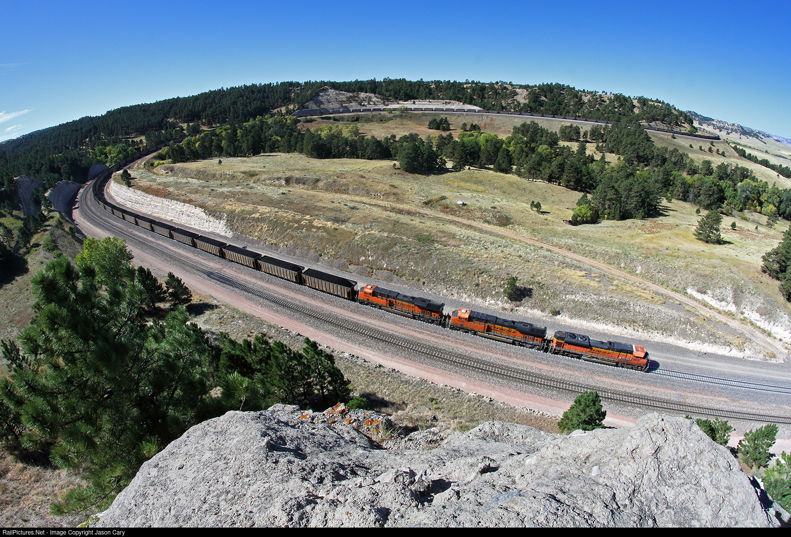 Push! A eastbound train of black Wyoming low sulphur coal is shoved up the 1.55% grade of Crawford Hill. One of the few places that is still untouched by urban sprawl, perhaps one of the last of the best last places to railfan. The rear of the train is wrapped around the horseshoe as the rest of the train rounds Breezy Point. The old ROW can be seen clearly and had a grade of 2.2% but was widened out in the 1970s. Special thanks to my son for handing my camera equipment to me after I climbed the spire.