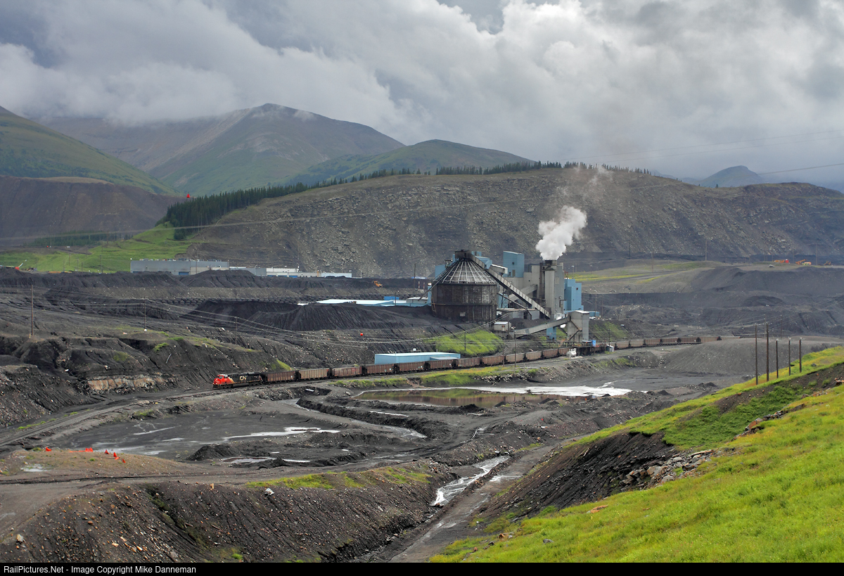 At Teck’s Cardinal River Operation near Cadomin, Alberta, on August 8, 2016, a third section of a 150-car Canadian National coal train has finished loading its 50 cars and is now heading downgrade toward Leyland and a trip east (north) on the railroad’s Mountain Park and Foothills Subdivisions. The train loaded with two ES44ACs on the head end, but one of those units is now set up as rear DPU and will continue its duty as rear DPU after the train is combined with the other two sections at Bickerdike (near Edson). Right now though, both will be needed to ease the loads down a steep 3% grade of the 5.5-mile Luscar Industrial Spur. The mine produced steelmaking coal for 51 years and, unfortunately, ceased operations in June 2020.