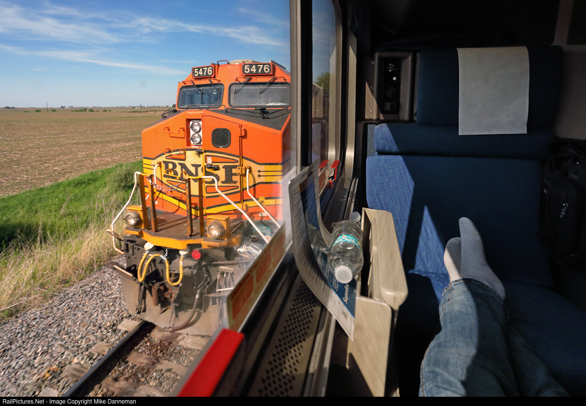 A room with a view to the show With freight train congestion ahead, a slick move by the BNSF dispatcher, at least for the passengers of Amtrak’s train 5, crossed the westbound California Zephyr over to the south track or Main 2, all the way from Montgomery to Galesburg, Illinois, on May 21, 2023. During that time, the Zephyr passed five westbound BNSF freights and met an eastbound BNSF Z train flying toward Chicago, all neatly orchestrated to keep the passenger train from losing time on the busy subdivision. We pass the third westbound at track speed zipping toward Galva as seen from Roomette 9 in the 531 car. And the windows were clean too!