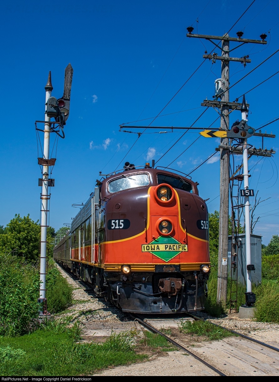 | SLRG 515, a former 1953 Chicago & Northwestern EMD E-8A currently wearing Iowa Pacific colors, splits the semaphores at the Karstens crossing as it leads the Nebraska Zephyr down the Illinois Railway Museum's mainline during the annual Diesel Days event. |