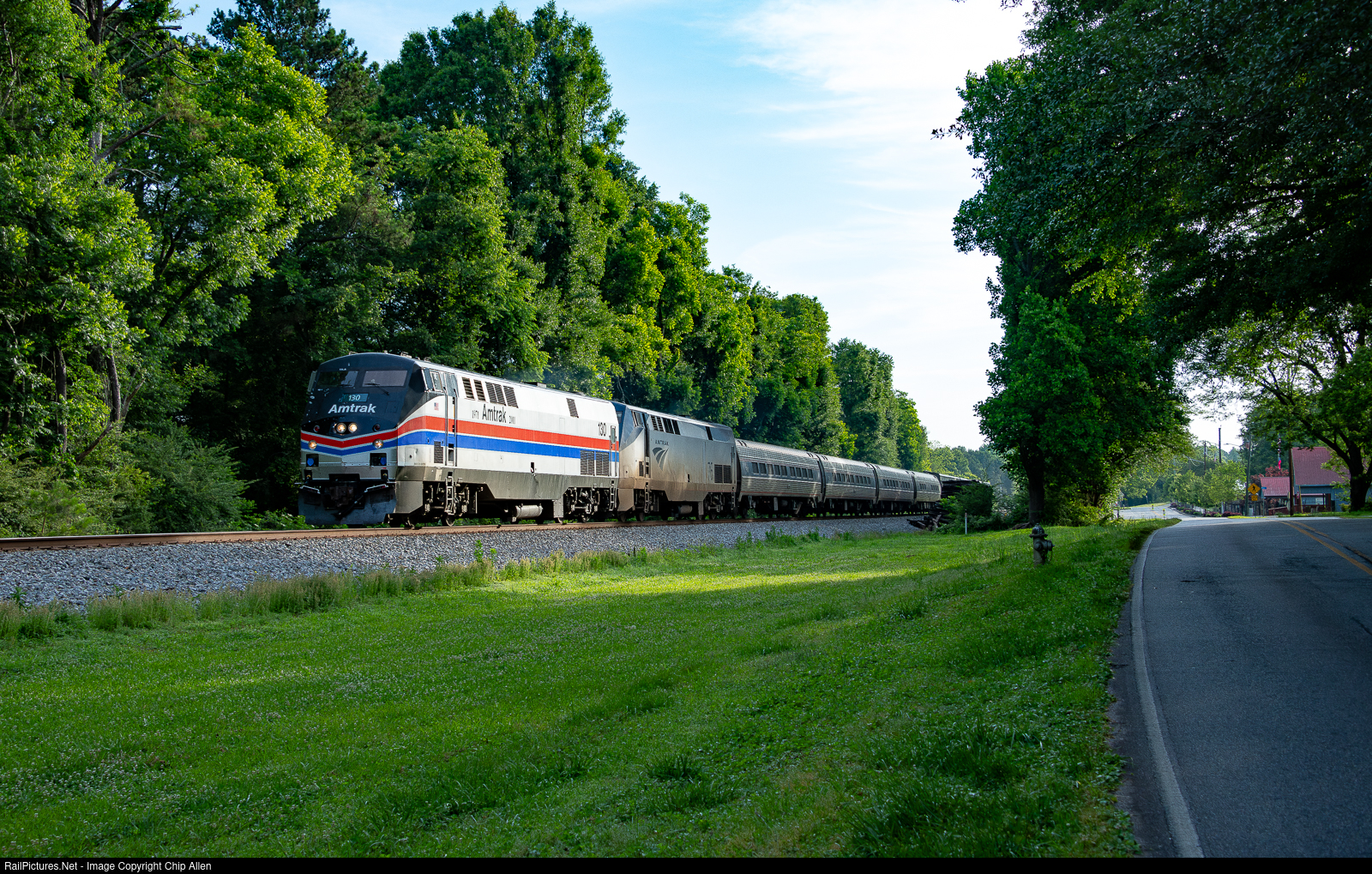 | On a humid morning, the southbound Amtrak Crescent flies through the tiny town of Oakwood with P42DCs 194 and 71 doing the honors for the trip to New Orleans. |