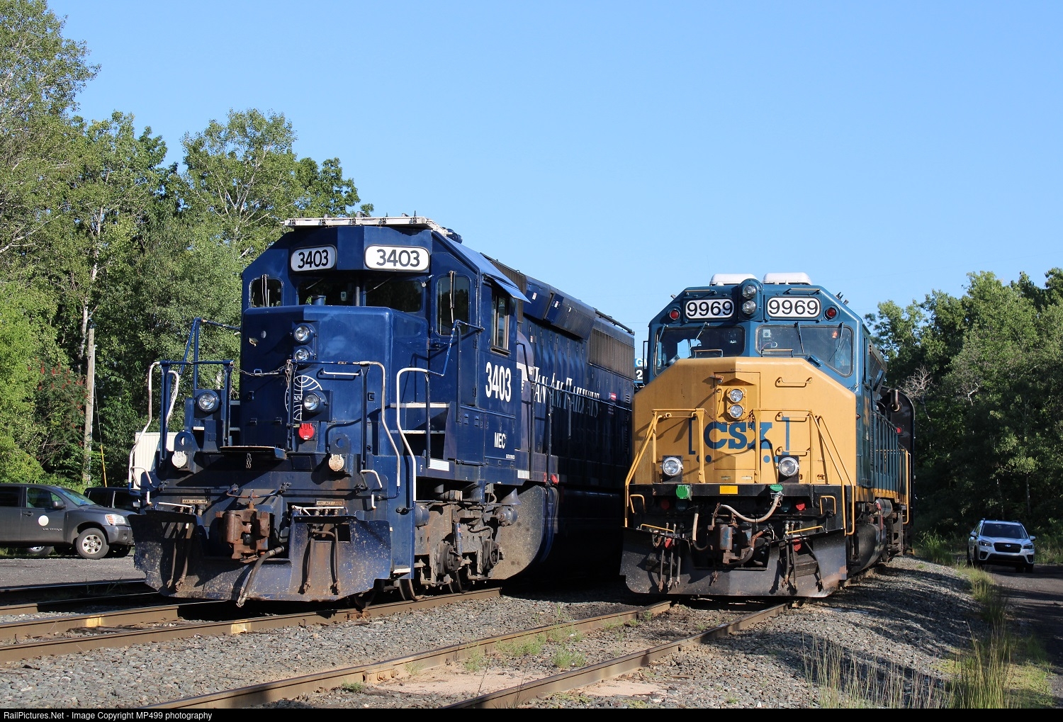 | MEC SD40-2 3403 which is the lead locomotive for RJ-1 sits next to the CSX geometry train in Rotterdam Junction. RJ-1 would head down to the Scotia Industrial Park, where they would set out two units and head to Mechanicville. The geometry train would head to Selkirk after completing its tour of the former Pan Am system. |