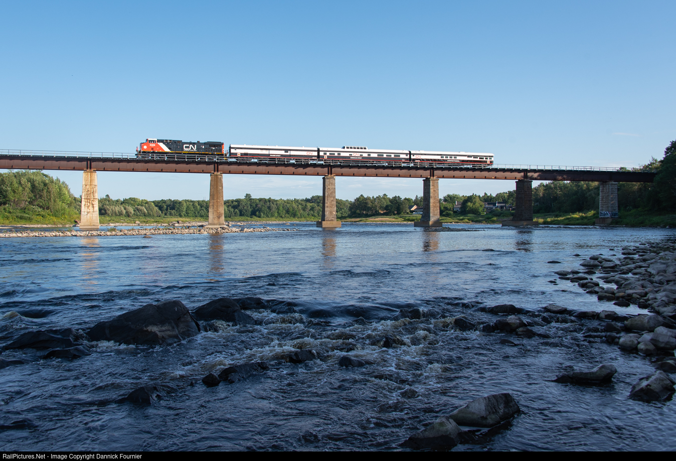 Eastbound CN 688 CN Executive Office Train rumbles across the Chaudière River bridge