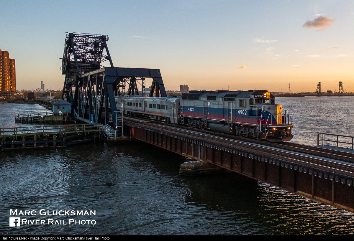 Where The Beachballs Still Roam. On the evening of November 5, 2022 MTA Metro-North Railroad/Metro-North Railroad 4902 (GP40FH-2) leads NJ TRANSIT Train 1877 over HX draw from Secaucus, New Jersey to East Rutherford New Jersey at sunset with Upper Hack Lift in the background. Under agreements between the various stakeholders, NJ Transit operates service on both on its is own New Jersey portion as well as the New York sections of the Pascack Valley and Bergen/Main/Port Jervis Lines, in exchange for which they receive both payment and equipment from the State of New York. The equipment is "pooled" out of Hoboken, and so is commonly mixed with similar NJ Transit equipment. This GP40FH-2 is part of the fleet of 15 locomotives and 65 cars owned by MTA Metro-North and operated on West-of-Hudson runs. And while there are not "heritage" units within per se, this "beachball" paint scheme if from the last generation of design and was recently applied to a P32AC-DM in East-of-Hudson service as part of Metro-North's 40th Anniversary.