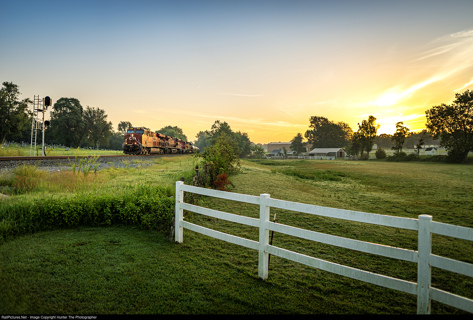 Flint Creek Sunrise | The sun has just risen over the town of Gentry, AR where a southbound crude oil tanker train knocks down the Flint Creek signal on a humid Thursday, August 24, 2023 morning.
