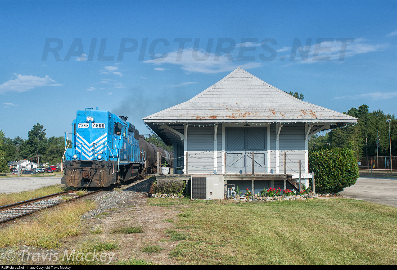 Lancaster & Chester train 10 passing the Southern Railway Depot in Heath Springs led by former Southern high hood GP38AC 2866