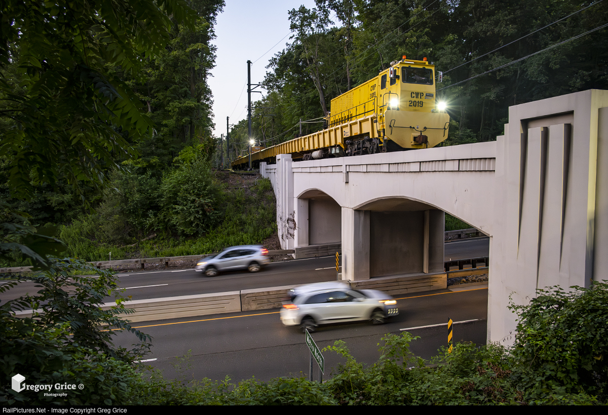 During the dusk hour of August 18th, 2023, Metro-North Railroad's Brandt Continuous Work Platform (CWP/"Slot Train") crosses the Merritt Parkway in the Talmadge Hill neighborhood of New Canaan, Connecticut, while picking up used rail tie bundles along the New Canaan Branch. Right-of-way clean-up is one of the final tasks to be completed during the Connecticut Department of Transportation's (CTDOT) 2023 New Canaan Branch Track Improvement Program.