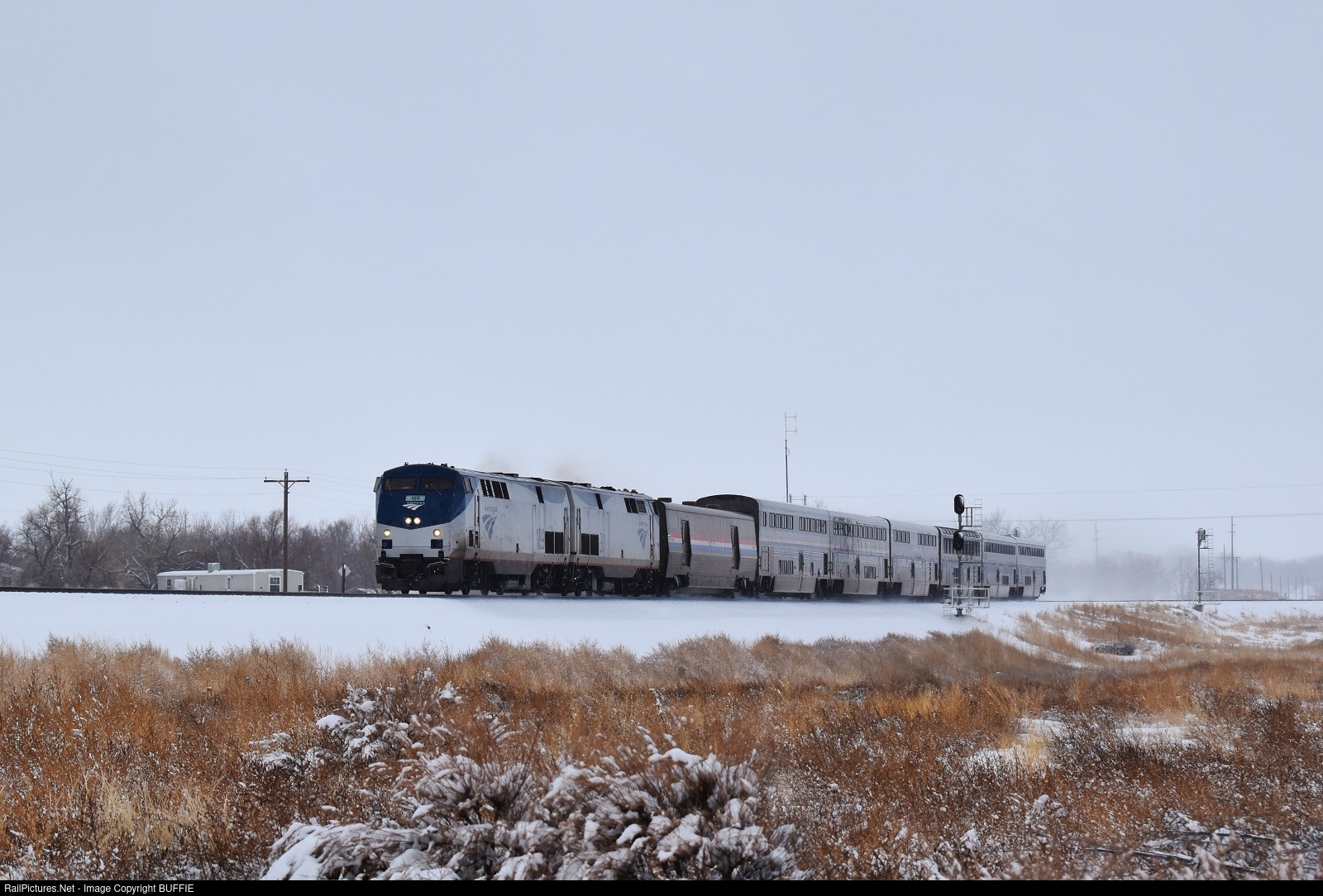 The California Zephyr runs in the freezing snow as it heads east through Fort Morgan, Colorado.