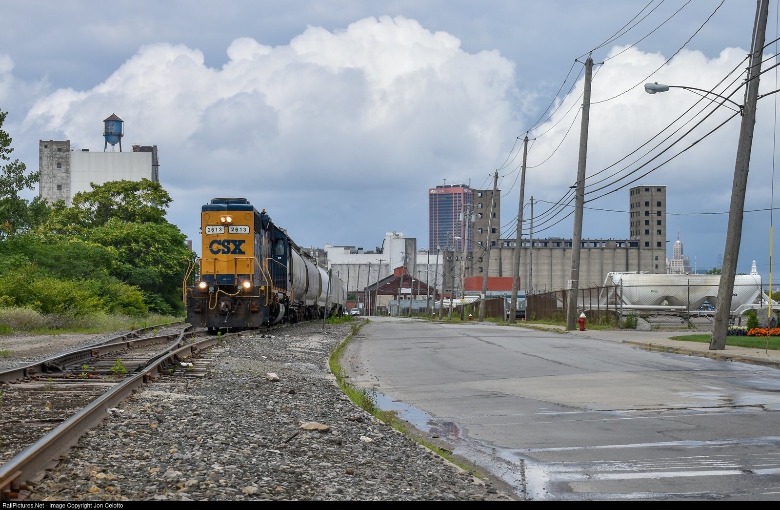 | CSX Y133 leaves the General Mills plant behind as it heads towards Ohio Street yard just south of downtown Buffalo. Some really nice clouds fill up the sky behind it, and while the roads look like they're wet from rain, it's actually from some firemen testing a hydrant a few yards behind where I was standing. |