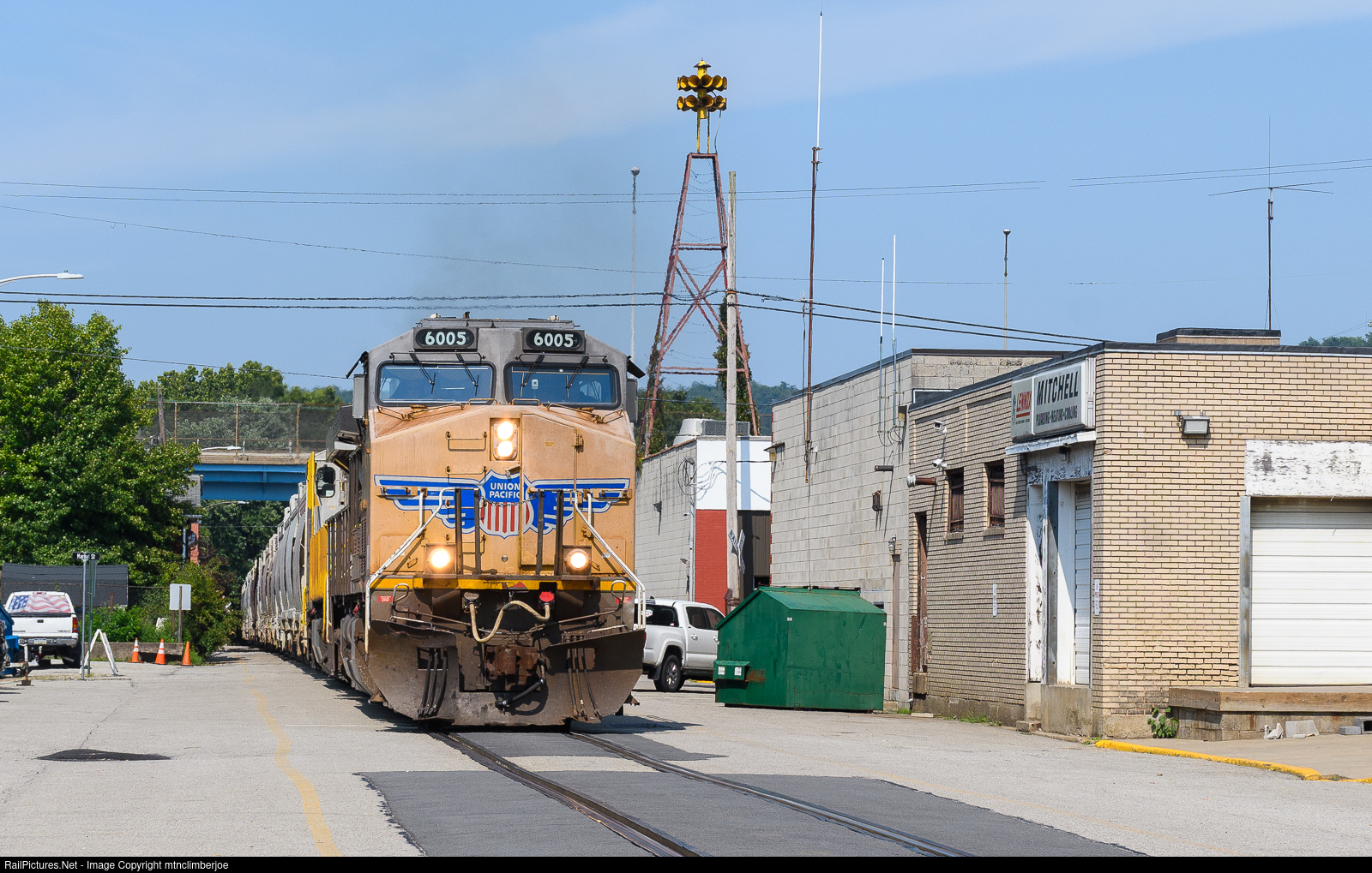 CSX loaded sand train B454 slowly makes its way along the street running through South 1st Avenue in Elizabeth, Pennsylvania on CSX's Mon Subdivision. A UP AC4400CW and a former Citirail, now CN, ES44AC power the train as it heads towards Newell where it will terminate, before eventually being recrewed as an R131 job to be delivered to Fairmont, West Virginia.
