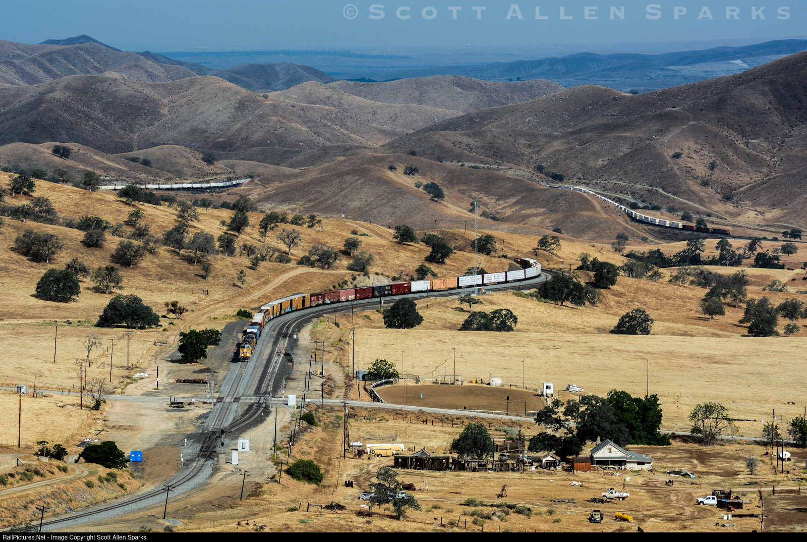 A south bound UP manifest climbs the steep grade out of the Allard horseshoe area and in to Bealville, as a north bound BNSF intermodal, that had just met the manifest at the west end of Bealville siding, is seen quickly descending the grade between tunnels 1 and 2.