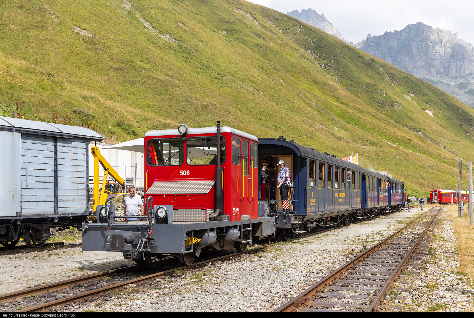 | Steamtrain 134 of the Dampfbahn Furka Bergstrecke from Oberwald to Realp just reached Furka DFB station on 2160 meter a.s.l. The red diesel shunter Tm 2/2 # 506, built in 1953 by Asper for the Chemins de fer du Jura, shoved the train through the 1874 meter long Furka summit tunnel from Muttbach-Bélvedère. This is a requirement of the operating regulations for safety reasons. |